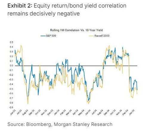 Wilson表示,去年12月初,他们认为10年期美债收益率在4.00%-4.50%区间是股票市盈率的“最佳区间”。如果突破4.50%,股票对利率的敏感性可能会增加。当利率在12月突破这一水平时,股票市盈率确实出现了压缩,股票收益率与债券收益率之间的相关性更是明显转为负相关。