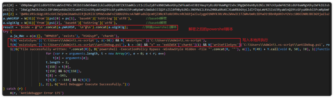 之后脚本通过Base64解码对加密内容进行解密,并生成PowerShell脚本用于反调试。该脚本通过调用反调试技术,试图阻止安全分析工具对恶意样本调试。