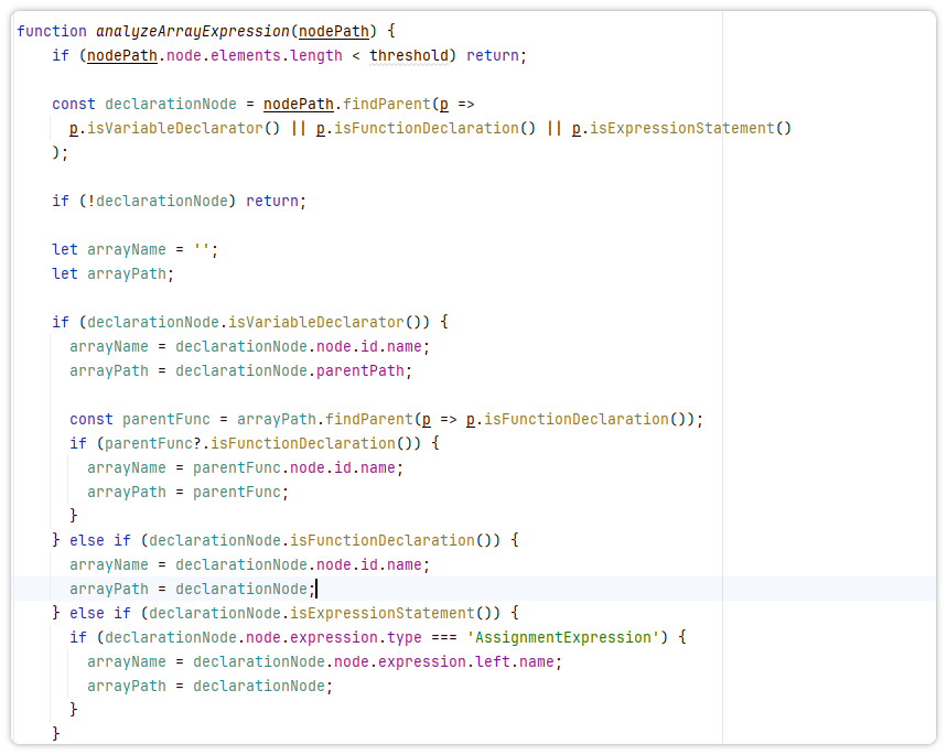 通过追踪最长数组的引用关系,找到解密器的核心逻辑。解密器通常用于动态还原被混淆的字符串或函数,从而恢复代码的可读性。