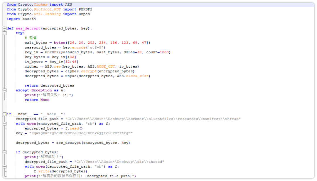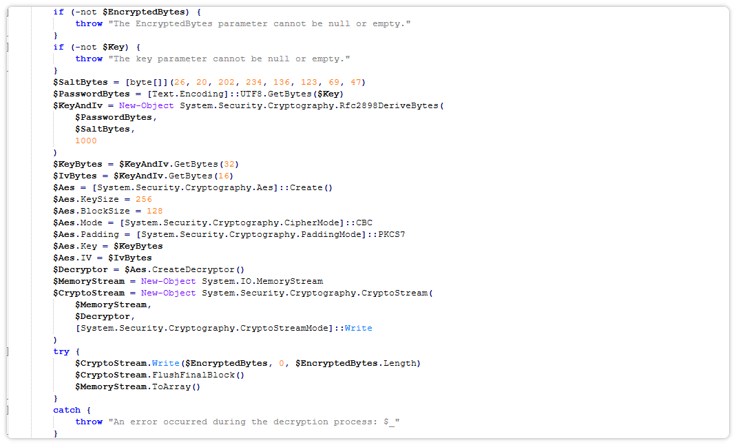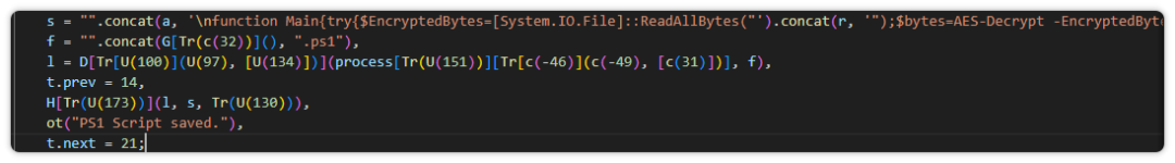 样本将加密的后门模块打包进Electron程序,首先采用PowerShell方式对后门模块进行AES加盐解密。