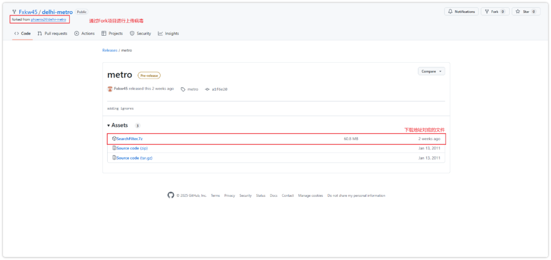 其下载链接指向了一个Fork的GitHub项目,攻击者利用GitHub的合法外衣来托管恶意样本。
