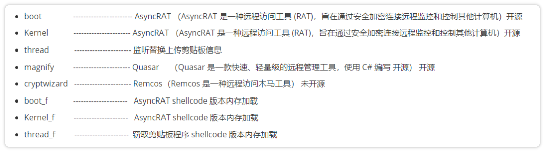 boot和Kernel:这两个模块是AsyncRAT的后门,AsyncRAT是一种开源的远程访问工具(RAT),通过安全加密连接实现远程监控和控制。