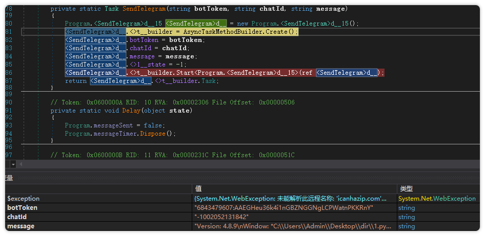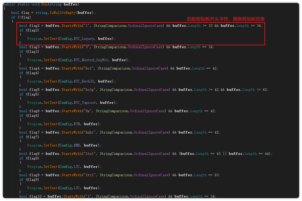 对thread模块进行分析,发现其是剪贴板程序,其主要负责监控剪贴板信息,并匹配剪贴板首字符替换相应的矿池地址,并将其原始剪贴板信息发送到Telegram Bot,其thread_f模块对应其shellcode内存加载.net版本。