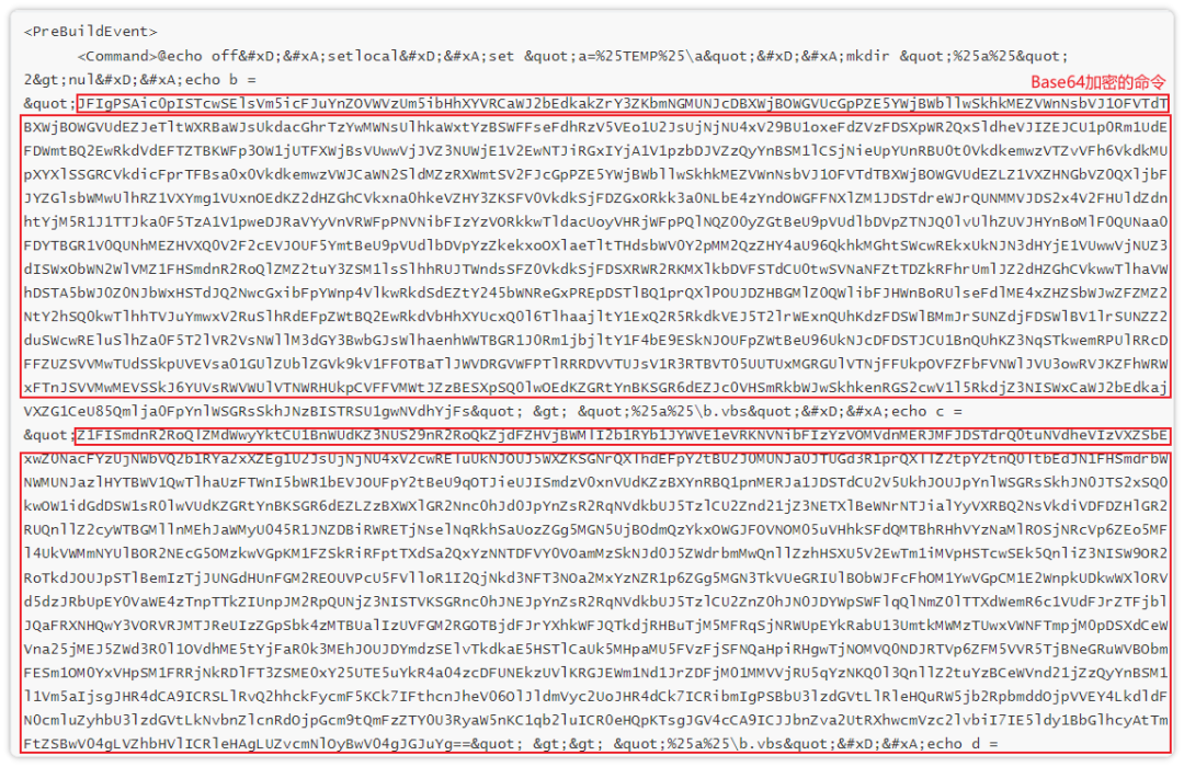 对其执行的命令进行分析,发现攻击者采用了Base64加密的VBS脚本。解密后,脚本内容被写入到名为b.vbs的文件中。
