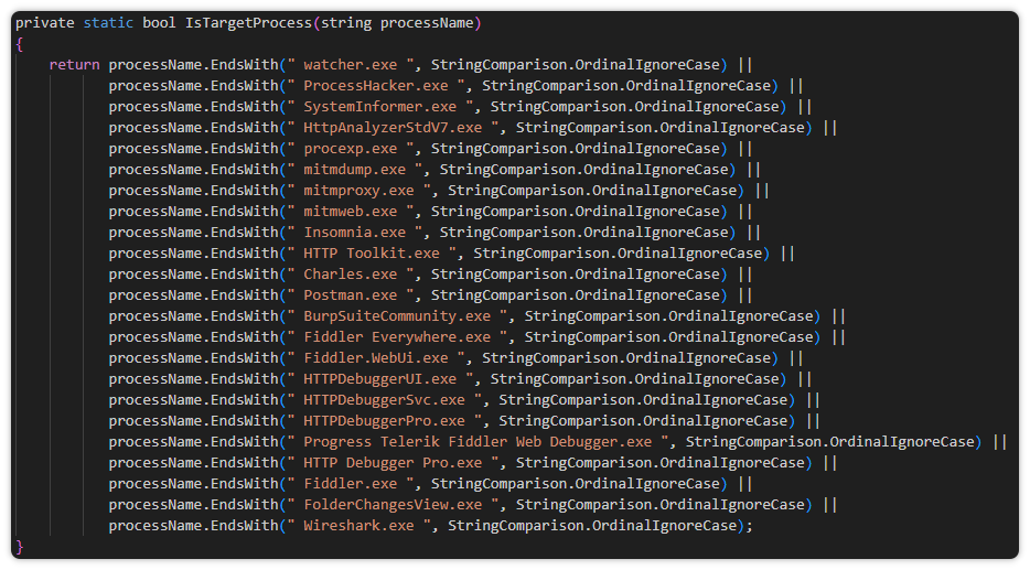 对生成的antiDebug.ps1进行分析,发现代码通过IsTargetProcess方法检测以下进程(均为常见的调试工具、网络分析工具和系统监控工具):