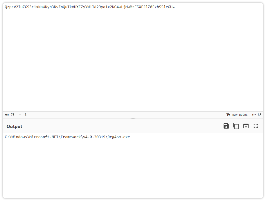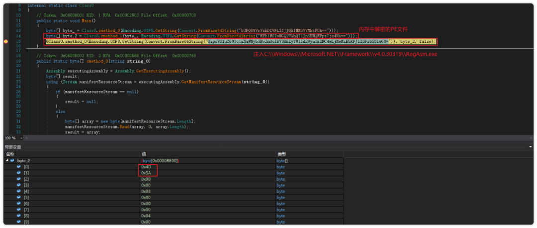 对其进行解混淆,分析其为注入器代码,解密内存中的PE,并将其注入到C:\\Windows\\Microsoft.NET\\Framework\\v4.0.30319\\RegAsm.exe。