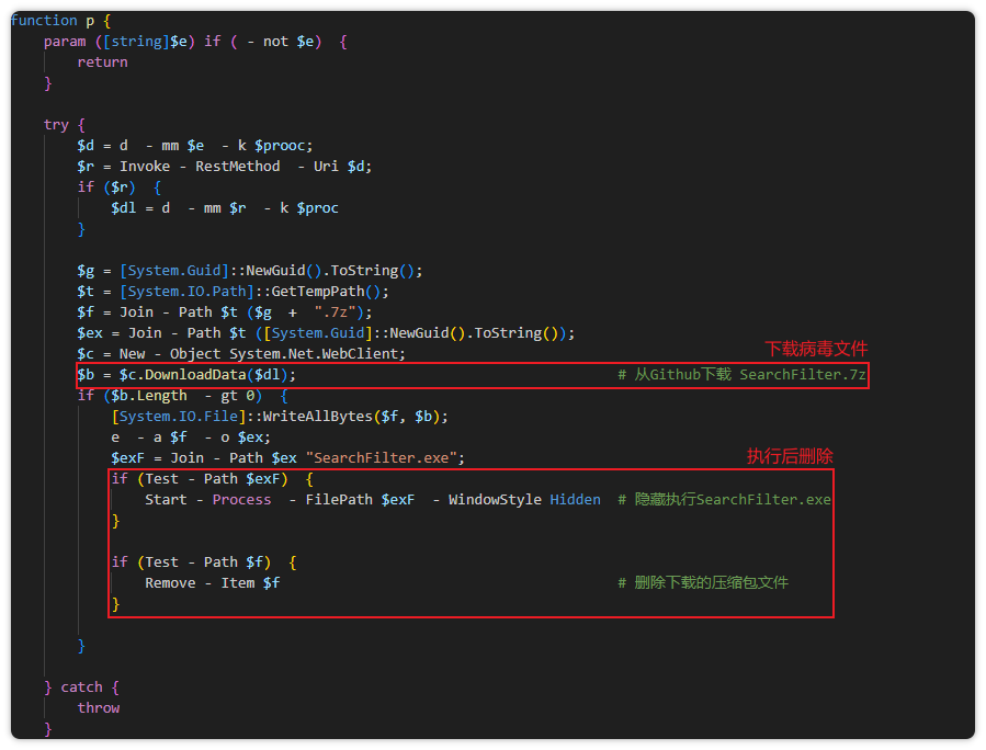 执行SearchFilter.exe:在下载并解压相关文件后,脚本会执行SearchFilter.exe,以加载后续的恶意功能。