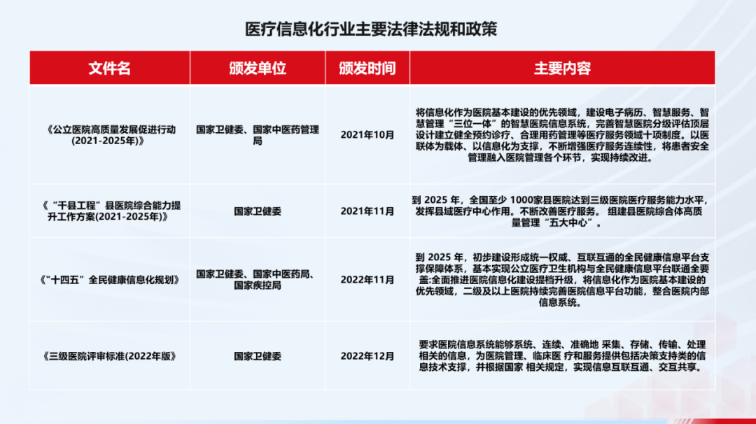最新的《三级医院评审标准(2022年版)》更是明确要求医院信息系统具备高效的数据采集、传输、存储和处理能力,全面提升医疗服务的信息化水平。上述政策的实施,为医疗行业信息化发展提供了清晰的方向和坚实的保障,加速推动医疗服务质量和效率的提升。