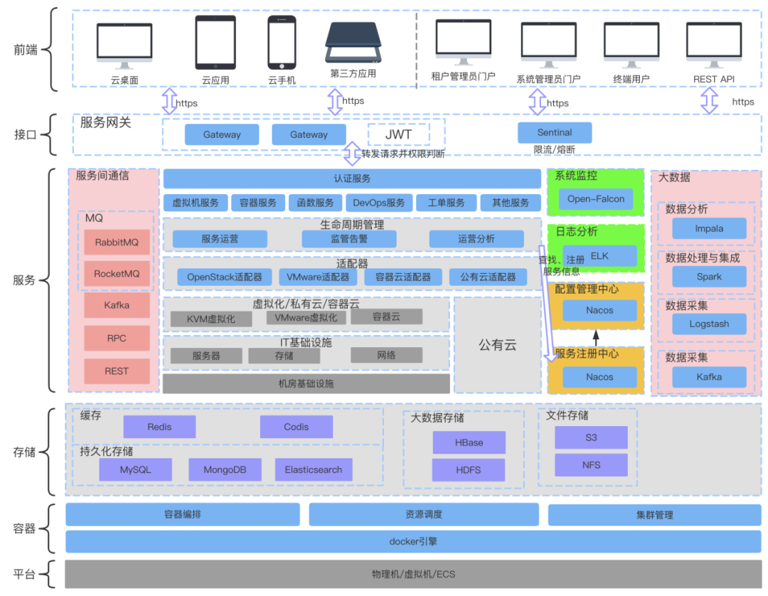 威努特云桌面系统包含平台、容器、存储、服务、接口、前端等主要模块,整体技术架构参考图3。