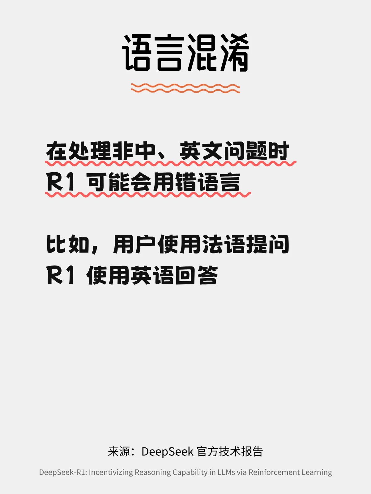 语言混杂:R1 在处理非中英文问题时,可能会出现语言混杂现象。