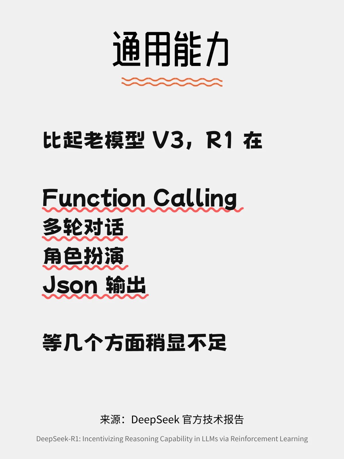 通用能力:R1 的通用能力 (例如函数调用、多轮对话、复杂角色扮演和 json 输出) 仍落后于 DeepSeek-V3。