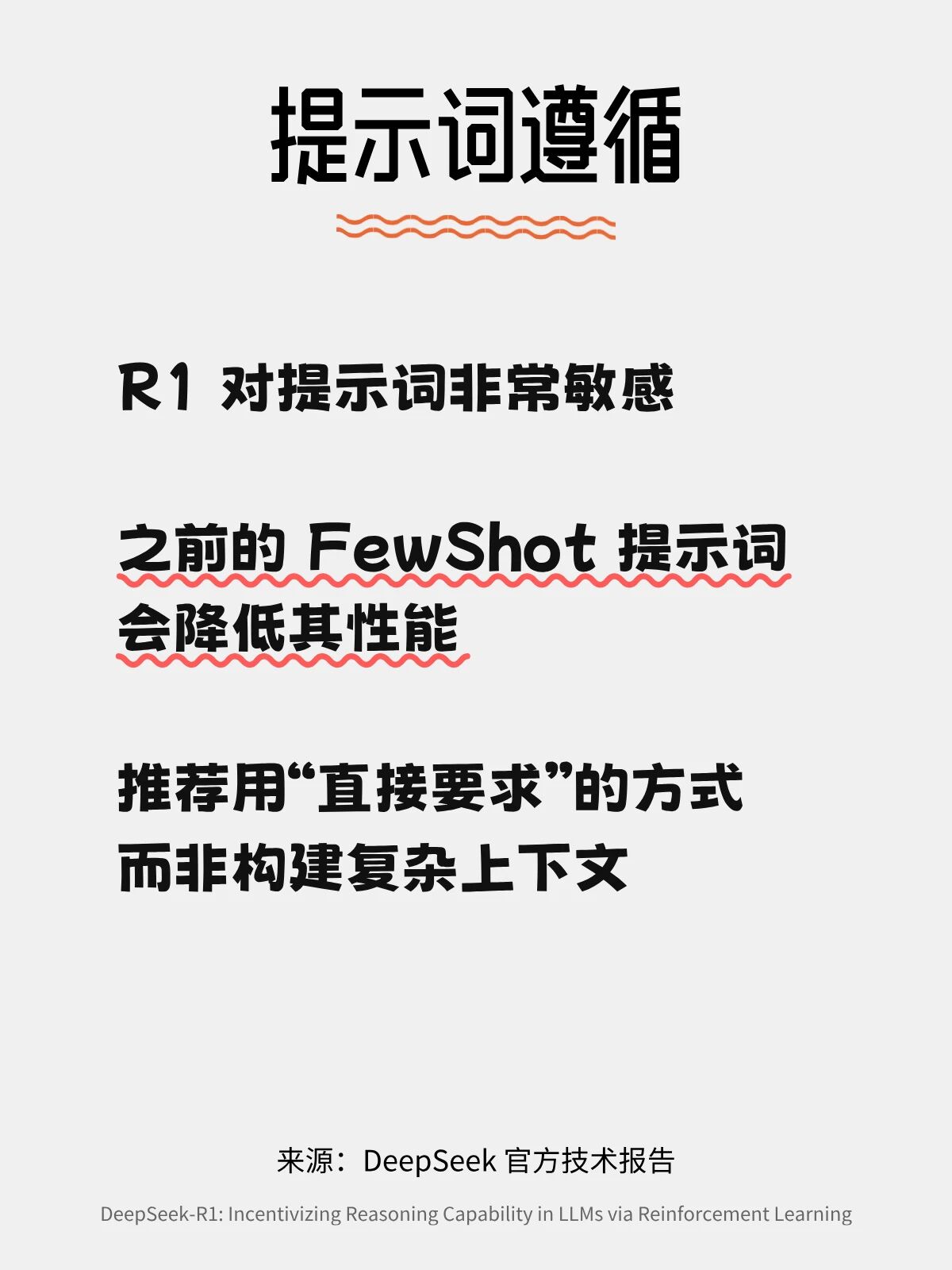 提示词工程:R1 对提示词较为敏感,使用 few-shot 提示可能会降低其性能。