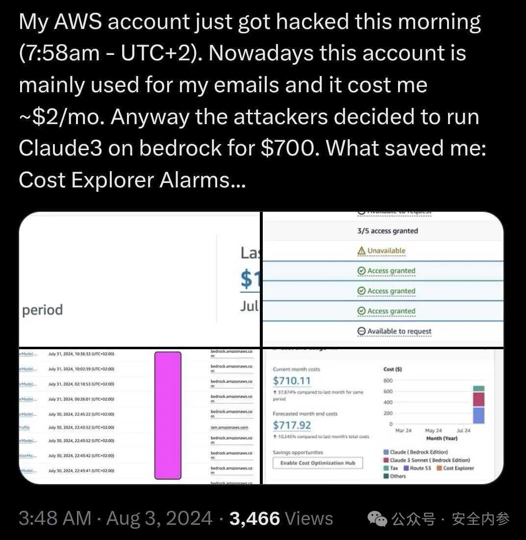 Morin回忆道:“我曾与一位推特用户交谈过,他的个人AWS账户因大模型劫持遭到入侵。他平时的AWS月账单大约2美元(主要用于调用大模型撰写电子邮件),但某天早晨醒来,他惊讶地发现短短两三个小时内,账单竟飙升至730美元。”