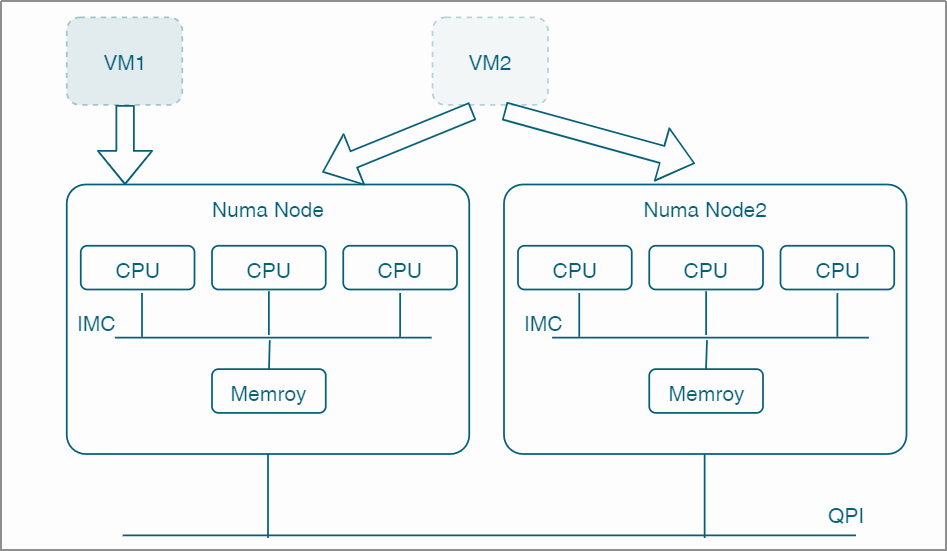 对于物理CPU,为扩展内存,现代CPU常使用多NUMA架构。多NUMA架构的物理CPU中,存在多个NUMA Node,每个NUMA Node都有CPU和内存,不同NUMA Node之间通过QPI(Intel)等总线进行通信,NUMA Node中的CPU和内存通过IMC总线进行通信。在威努特超融合架构下,CPU访问本地NUMA Node中的内存比访问其他NUMA Node中的内存具有更低的延时。