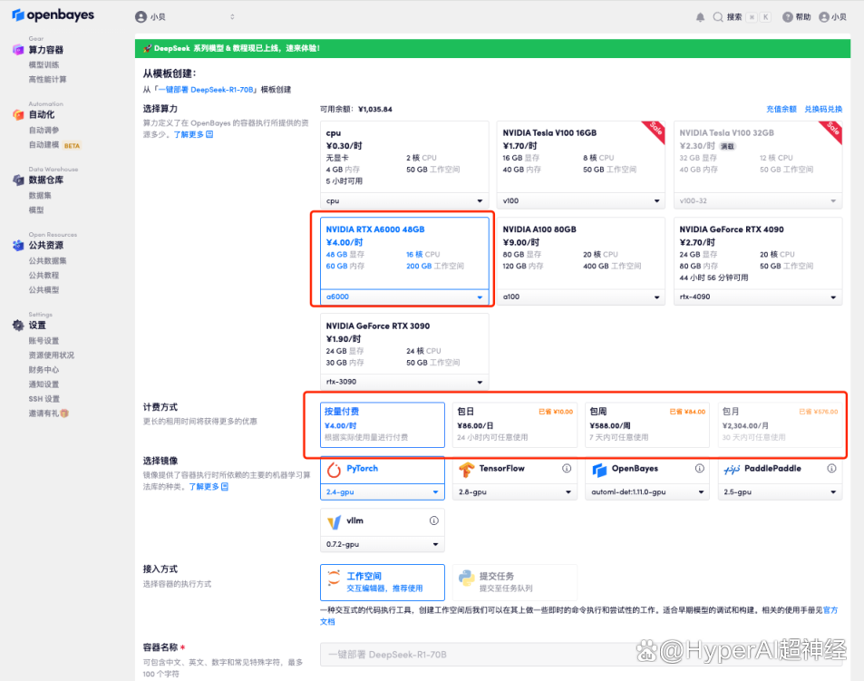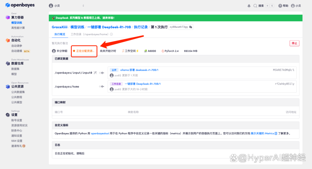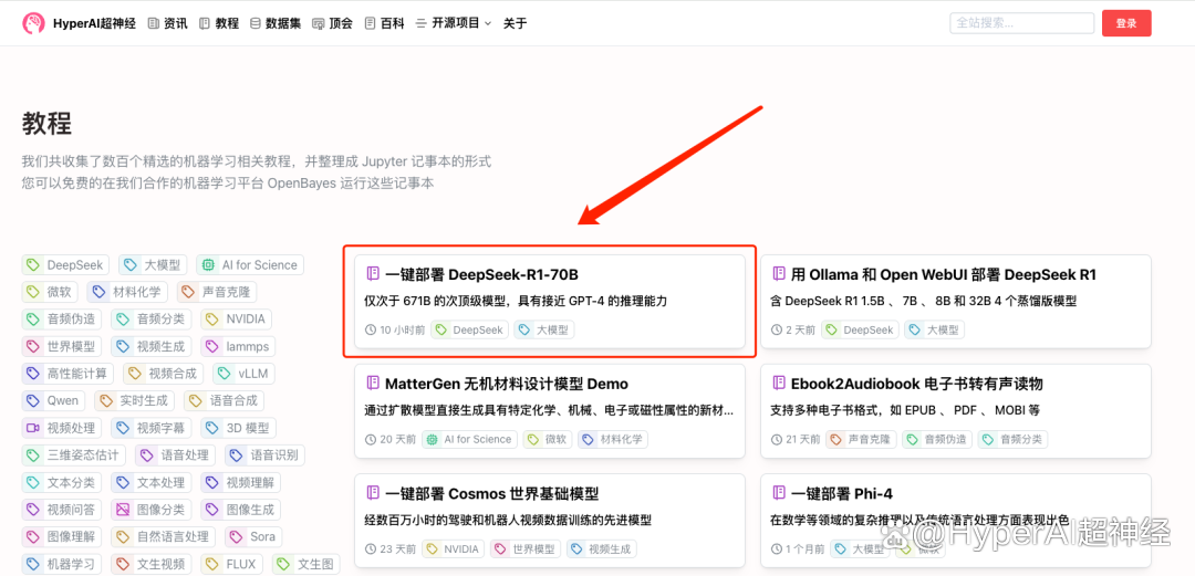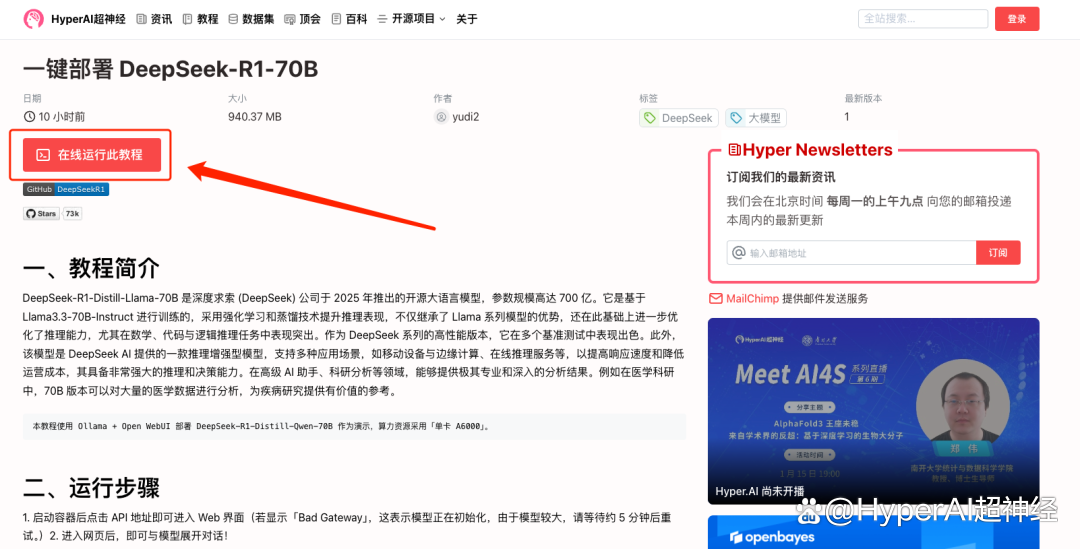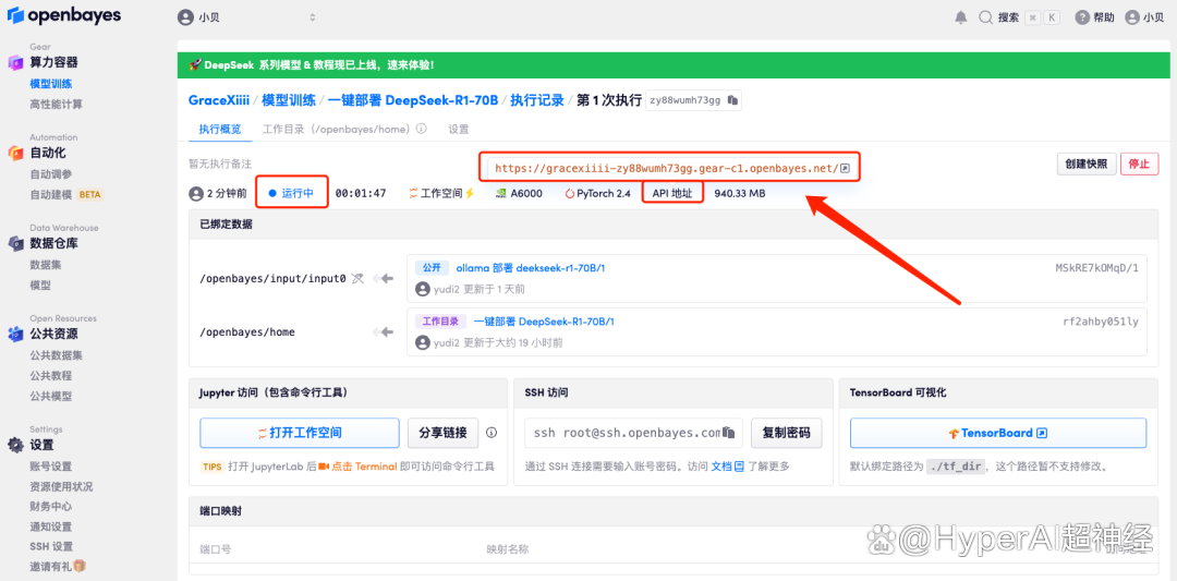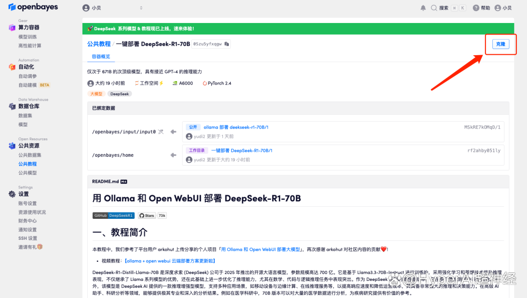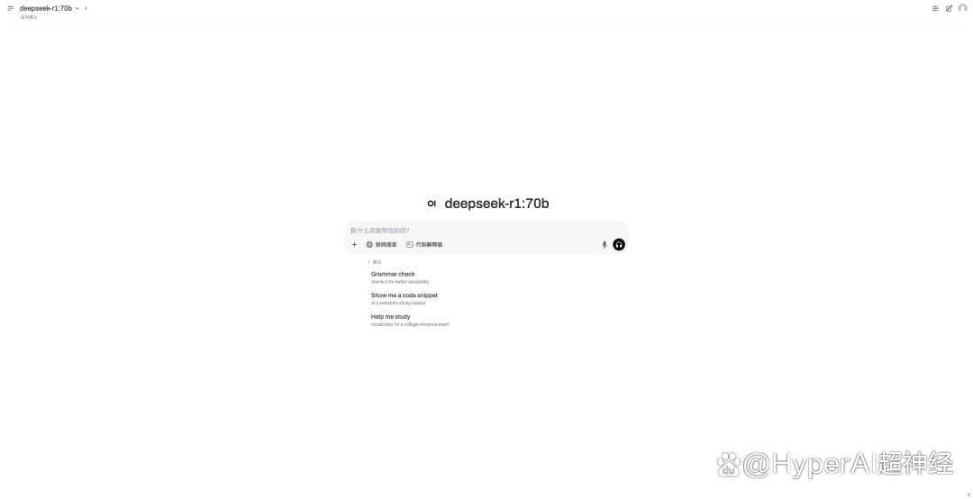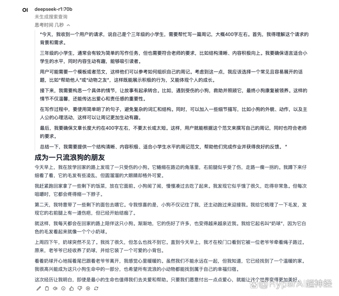 * 发布后 72 小时内注册用户超 50 万; * 日活跃用户数 18 天内突破 1,500 万,增速为 ChatGPT 的 13 倍; * 每日下载量近 500 万,登顶中美等 140 个国家应用商店下载量榜首; * 流量超越谷歌 Gemini,成为第二受欢迎的 AI 应用; * GitHub Stars 近 73k; * 超 16 家国产芯片厂商宣布适配; * 国内的三大运营商及多家汽车与手机厂商、网络安全服务商、医疗与金融服务商等相继官宣全面接入; * 亚马逊、微软及英伟达、AMD 等海外大厂官宣上线; * …… DeepSeek-R1 自发布以来,几乎是以天为单位地冲击着全球 AI 行业,更是在这个春节成功「破圈」,成为了人们茶余饭后热议的重点话题。 其中,有假期告急的学生用 DeepSeek 赶作业,也有灵感尚未返岗的打工人用它输出策划案,甚至有闲云野鹤的退休族用它做旅游攻略…… 然而,试问谁没遇到过「服务器繁忙,请稍后再试」? 为了帮助大家更顺畅地使用这个神器,HyperAI超神经官网的「教程」板块上线了「一键部署 DeepSeek-R1-70B」与「用 Ollama 和 Open WebUI 部署 DeepSeek R1」,一键告别「服务器繁忙」。 教程链接: * 一键部署 DeepSeek-R1-70B https://go.hyper.ai/fzbQ9 * 用 Ollama 和 Open WebUI 部署 DeepSeek R1 https://go.hyper.ai/PyCQv 接下来小编将以「一键部署 DeepSeek-R1-70B」为例,为大家展示教程及效果~ 1. 登录 hyper.ai,在「教程」页面,选择「一键部署 DeepSeek-R1-70B」,点击「在线运行此教程」。 2. 页面跳转后,点击右上角「克隆」,将该教程克隆至自己的容器中。 3. 选择「NVIDIA RTX A6000」以及「PyTorch」镜像,OpenBayes 平台上线了新的计费方式,大家可以按照需求选择「按量付费」或「包日/周/月」,点击「继续执行」。新用户使用下方邀请链接注册,可获得 4 小时 RTX 4090 + 5 小时 CPU 的免费时长! HyperAI 超神经专属邀请链接(直接复制到浏览器打开): https://openbayes.com/console/signup?r=Ada0322_QZy7 4. 等待分配资源,首次克隆需等待 2 分钟左右的时间。当状态变为「运行中」后,点击「API 地址」旁边的跳转箭头,即可跳转至 Demo 页面。请注意,用户需在实名认证后才能使用 API 地址访问功能。 1. 打开 API 地址,输入问题(例如:我是 3 年级的小学生,请帮我写一篇周记,要求 400 字左右),打开「联网搜索」后,点击发送。 2. 等待片刻, 我们不仅可以看到它的回答,还可以看到它清晰的思考过程。