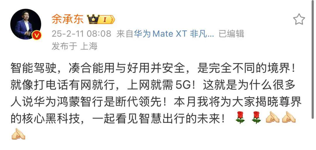第二天,华为车BU(智能汽车解决方案业务单元)董事长余承东隔空“喊话”,“智能驾驶凑合能用与好用并安全,是完全不同的境界!就像打电话有网就行,上网就需5G!”