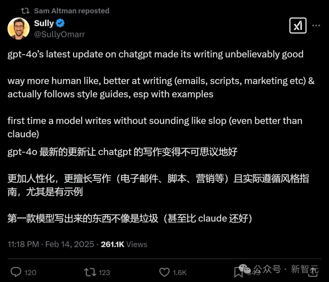 有网友表示质疑新gpt-4o是否会比claude写作能力更好,但网友Sully对此十分确定,「是的,我会这么说。」。