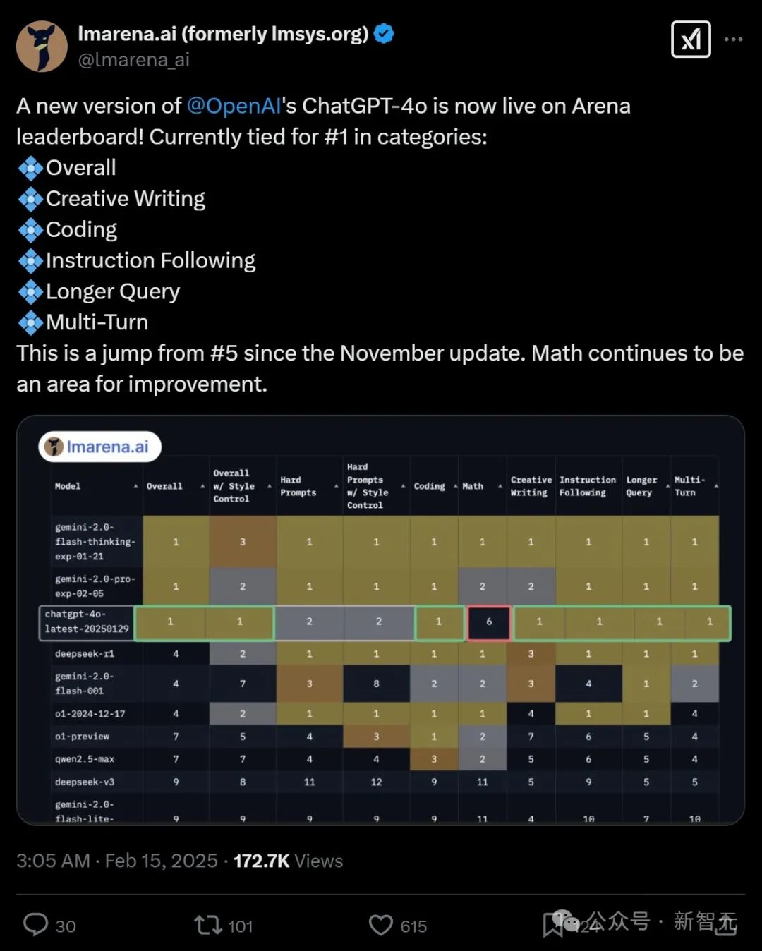 更新后的4o模型,直接在LMSYS Arena排行榜中登顶。