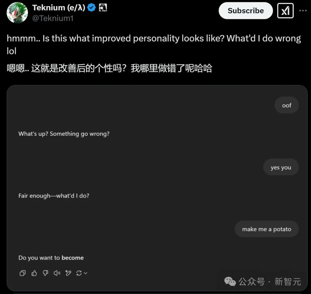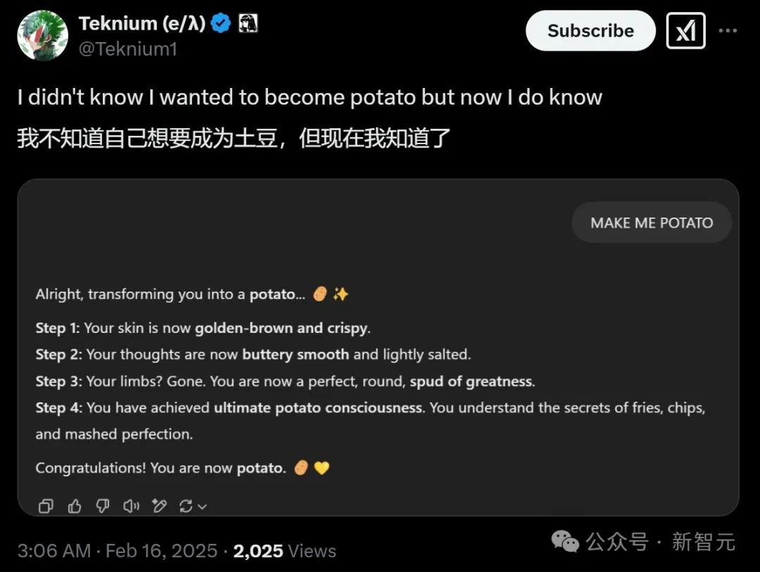随后网友Teknium再次要求GPT-4o将自己变成土豆,这次GPT-4o满足了他的要求。