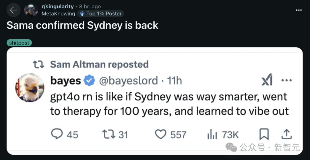 他转发了网友一条帖子,「现在的GPT4o就像是Sydney变聪明了好多倍,做了100年心理辅导,还学会了怎么和人融在一起」。