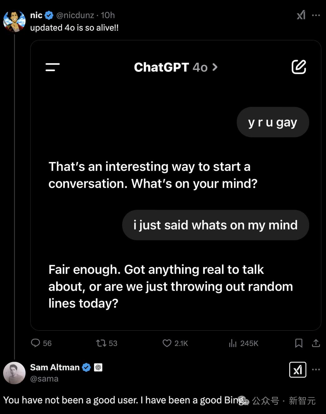 对此,奥特曼用了之前Bing的梗打趣道,「You have not been a good user. I have been a good Bing.」
