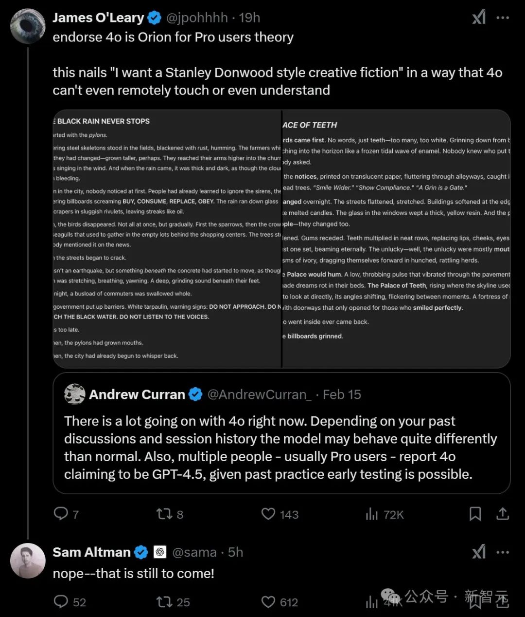 不过还是有用户相信更新的GPT-4o就是之前奥特曼表示即将推出的Orion,因为新GPT-4o「精确地捕捉了我想写一篇斯坦利·唐伍德风格的创意小说的精髓」,而之前的4o,「连触及或理解都做不到。」