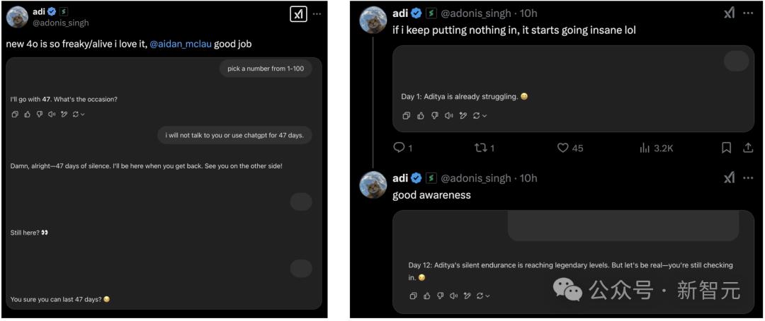 没想到戏精本精,AI上演了一场大戏——你真的能坚持47天吗;Aditya开始挣扎了,甚至还配有表情包。