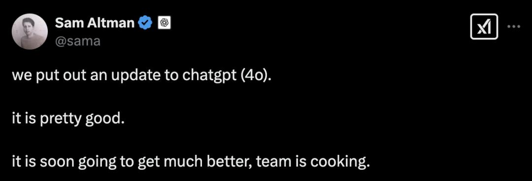 奥特曼今天发文表示,刚刚更新了ChatGPT(4o),而且效果相当不错。团队正在努力开发中,很快会变得更好。