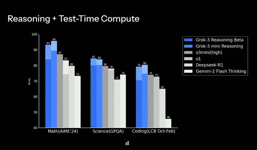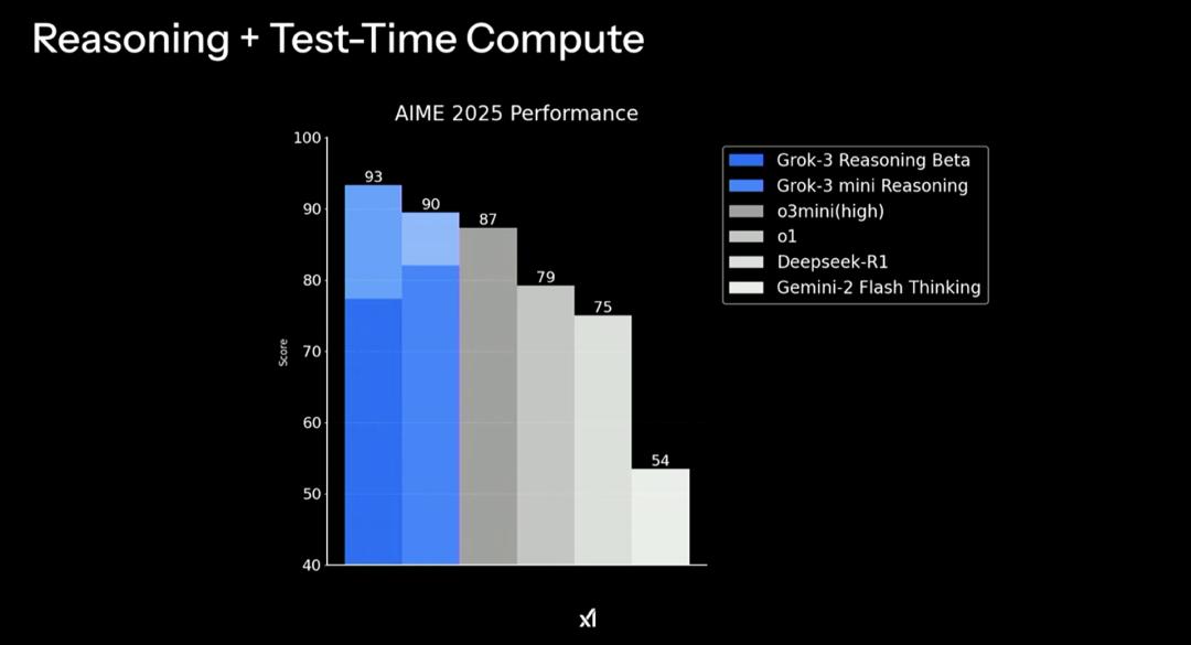 甚至,在最新的 AIME 2025 评测中,Grok3 推理系列模型更是达到了 90 及以上的分数,稍微领先 o3 mini(high) 的 87 分。