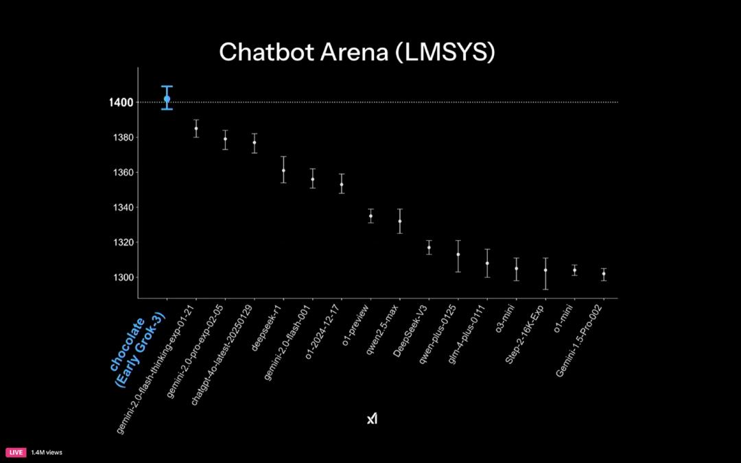 此外,在 Chatbot Arena 评估中,Grok-3 的得分达到了 1400 分,同样超过了 Gemini 系列和 chatgpt-4o 和 DeepSeek-R1。
