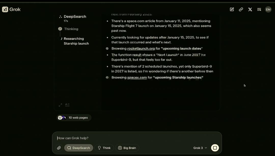 基于 Grok3 推理模型,Grok app 上线了 DeepSearch 功能,DeepSearch 可以表达其理解查询的过程以及计划响应的方式,会扫描互联网和 X,分析信息,并针对问题提供摘要。据现场演示 ,DeepSearch 包括研究、头脑风暴和数据分析等选项。