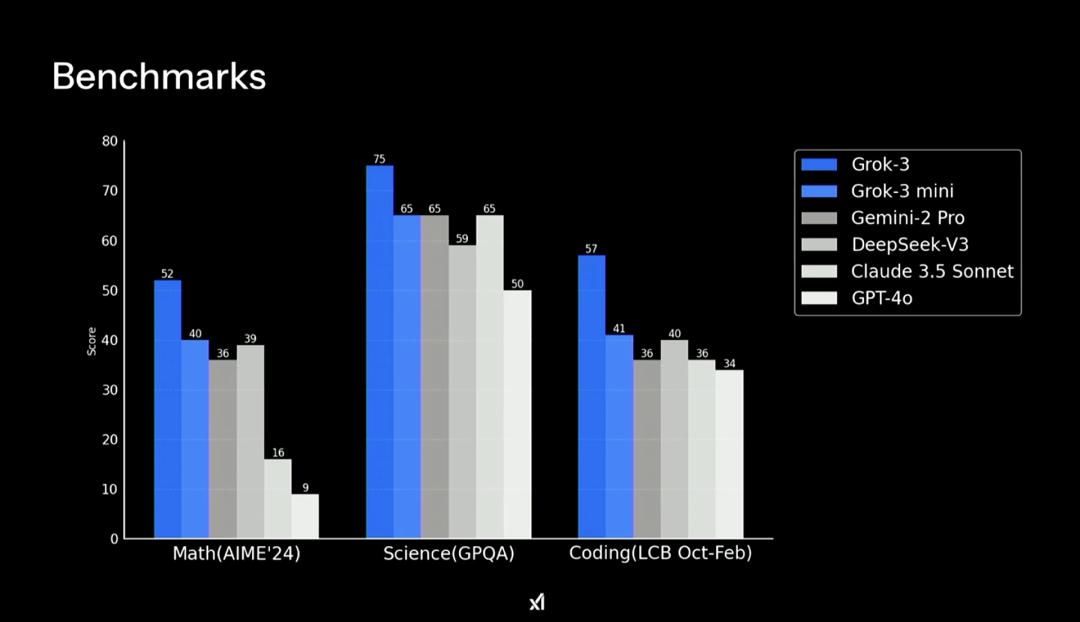 评测结果方面,Grok3 在 AIME'24(美国数学竞赛)、GPQA(研究生水平科学知识问答能力的基准测试)等测试中均取得了比 Gemini-2 pro、DeepSeek-v3、Claude 3.5 Sonnet 和 GPT-4o 更好的效果。