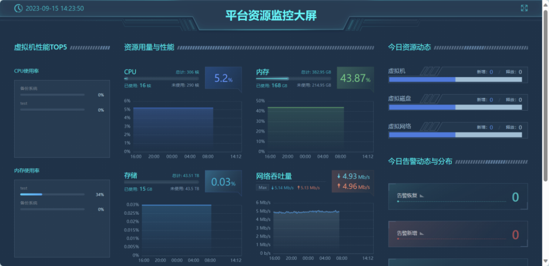 在陆地操控中心部署一套超融合统一管理系统,对作业区范围内所有海上平台智算中心的超融合系统统一纳管,实现远程对现场集群的硬件物理资源与虚拟化资源进行统一管理,其中,硬件物理资源包括节点运行、CPU/GPU、内存、磁盘等状态与使用情况;虚拟化资源包括虚拟机、虚拟网络、虚拟存储等状态与使用情况。提供统一的用户策略与日志告警平台,并支持利用一键巡检功能,随时了解各平台超融合系统的资源的健康状态。
