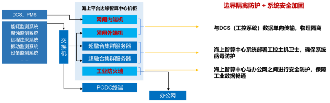 在海上平台智算中心与海上平台工控网之间部署一台工控安全隔离与信息交换系统,在与集团办公网之间部署一台工业防火墙,在海上平台智算系统虚拟机上部署工控主机卫士。