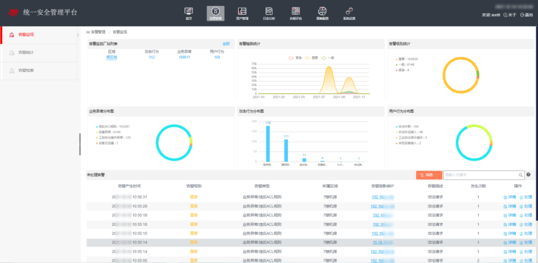 在陆地操控中心部署一台统一安全管理平台,对海上平台智算中心中工业互联防火墙、工控主机卫士、工控安全隔离与信息交换系统进行统一纳管。实时收集现场安全资产产生的安全事件、告警,并做到统一分析展示,同时可对现场的安全资产进行批量下发。