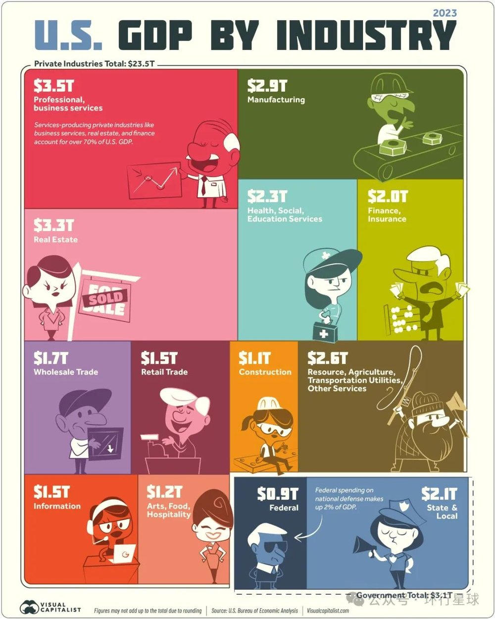 2023年,房地产业贡献3.3万亿美元,建筑业贡献了1.1万亿美元,属于美国经济绝对的支柱产业