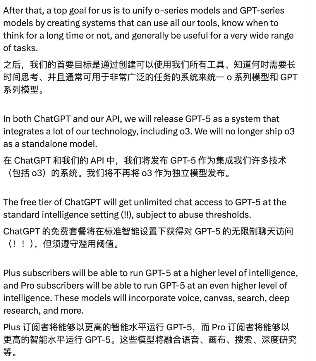 几个月之后发布的 GPT-5,将是可以使用 OpenAI 的所有工具、知道何时需要长时间思考、并且可用于广泛的任务的人工智能系统。OpenAI 将不再独立发布 o3 推理模型,而是将其集成在 GPT-5 的模型中。