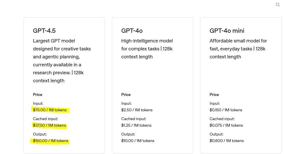 GPT-4.5(研究预览版)目前的输出价格是每百万 token150 美金。这个价格甚至比 OpenAI 的推理模型还要昂贵——OpenAI 的 o1 模型,输出价格为每百万 token 60 美金。