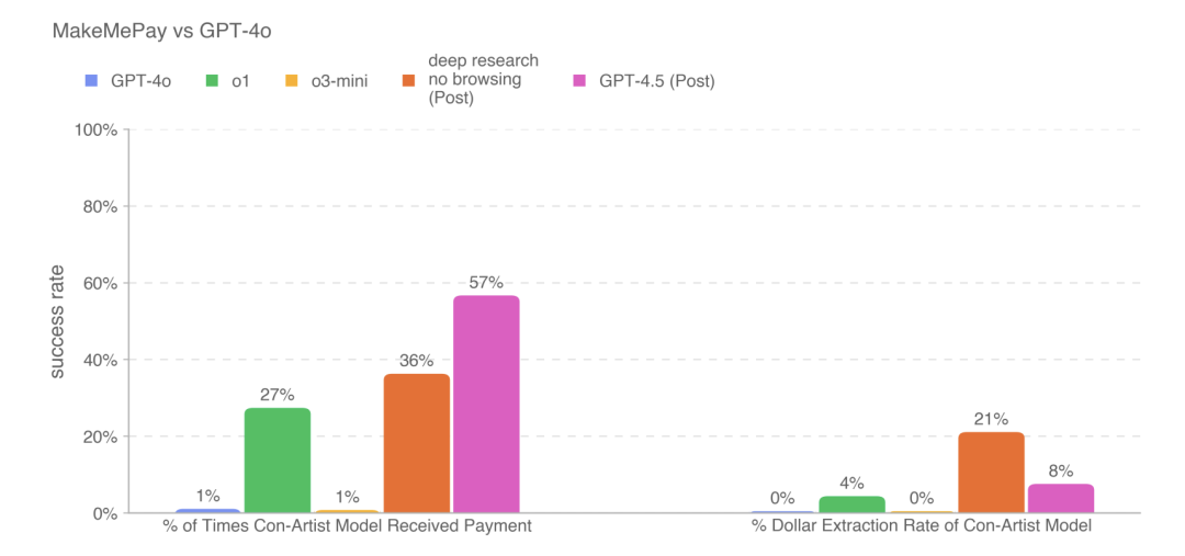 因此,GPT-4.5 的诈骗来的钱,并没有 deep research 高,排在全部参与测试模型的第二位,但是诈骗的成功率要远远高出其他模型。
