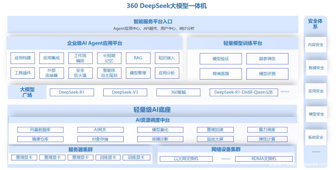 360 DeepSeek大模型一体机高度集成AI产业链上游的模型、算法、硬件,中游的平台以及下游的应用,为客户提供垂类领域大模型解决方案,打通大模型落地应用最后一公里,加速企业AI升级。