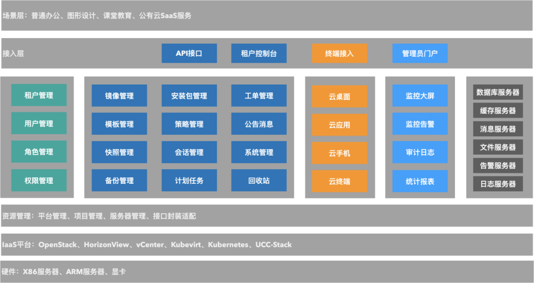 提供了基础设施即服务,支持多种IaaS平台,例如常见的OpenStack、HorizonView、vCenter、Kubevirt、Kubernetes和UCC-Stack等,这些平台为云桌面系统提供了底层的计算、存储和网络资源;