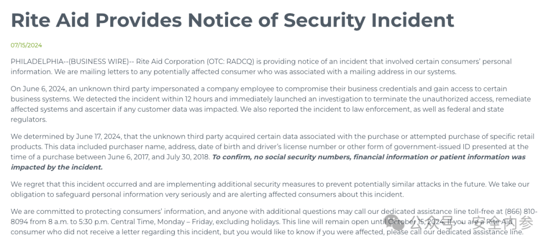 来爱德表示,公司在“12小时内检测到此次入侵,并立即展开调查,以阻止未经授权的访问、修复受影响的系统,并确认客户数据是否遭到泄露。”