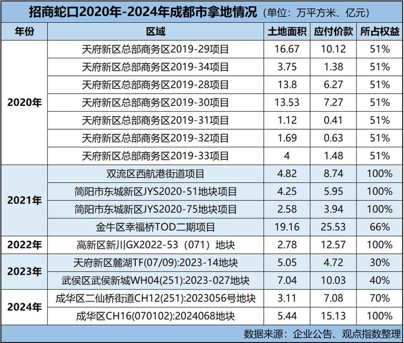 据观点新媒体统计,招商蛇口2020年至2024年通过土地招拍挂于成都共揽获16宗地块,其中2020年投拓力度最大,全年落子7个项目,且均位于天府新区。