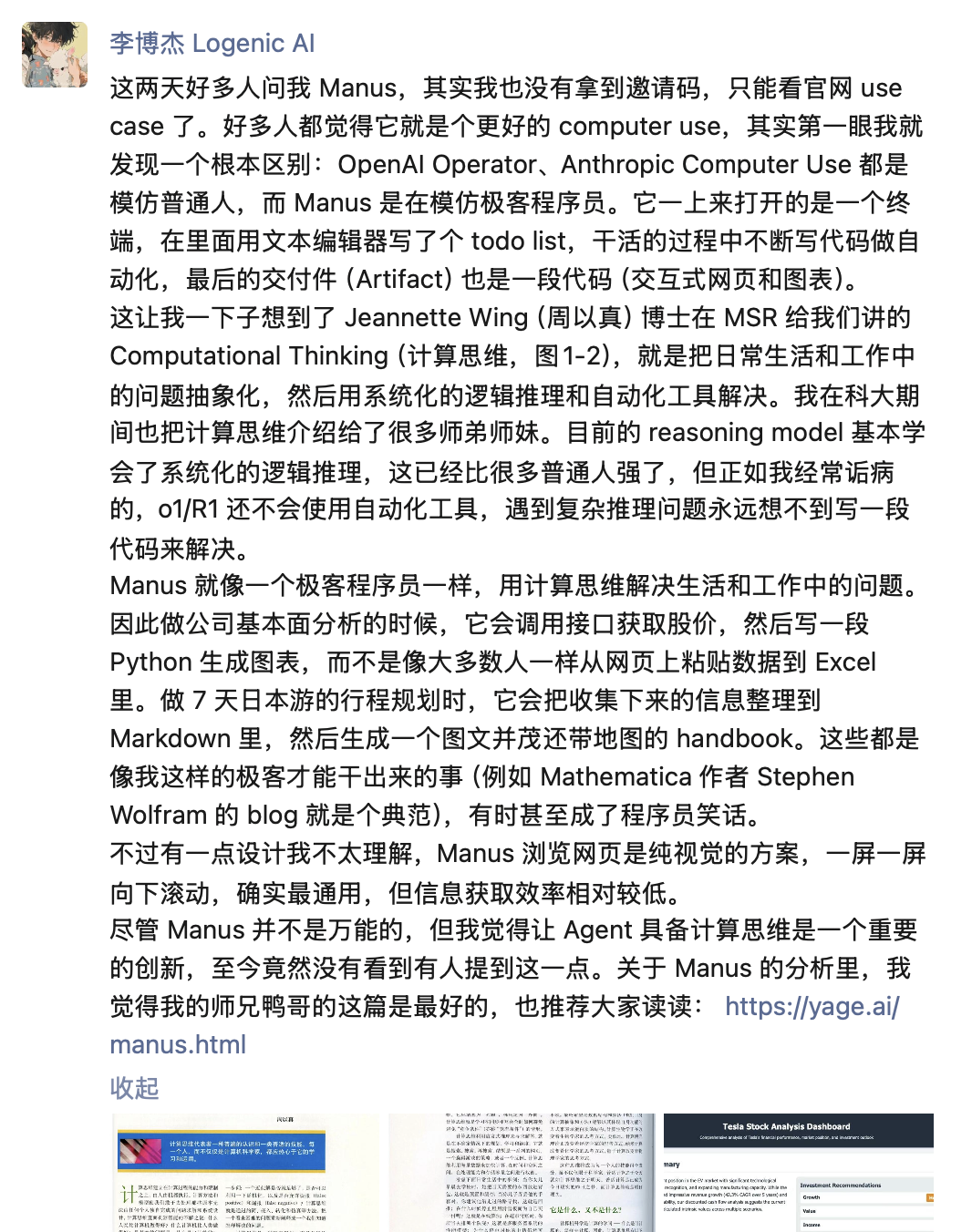 华为天才少年、Logenic AI 创始人李博杰认为 Manus 有一眼不同于其他产品的厉害之处:以极客程序员的方式解决问题。|图片来源:微信截图