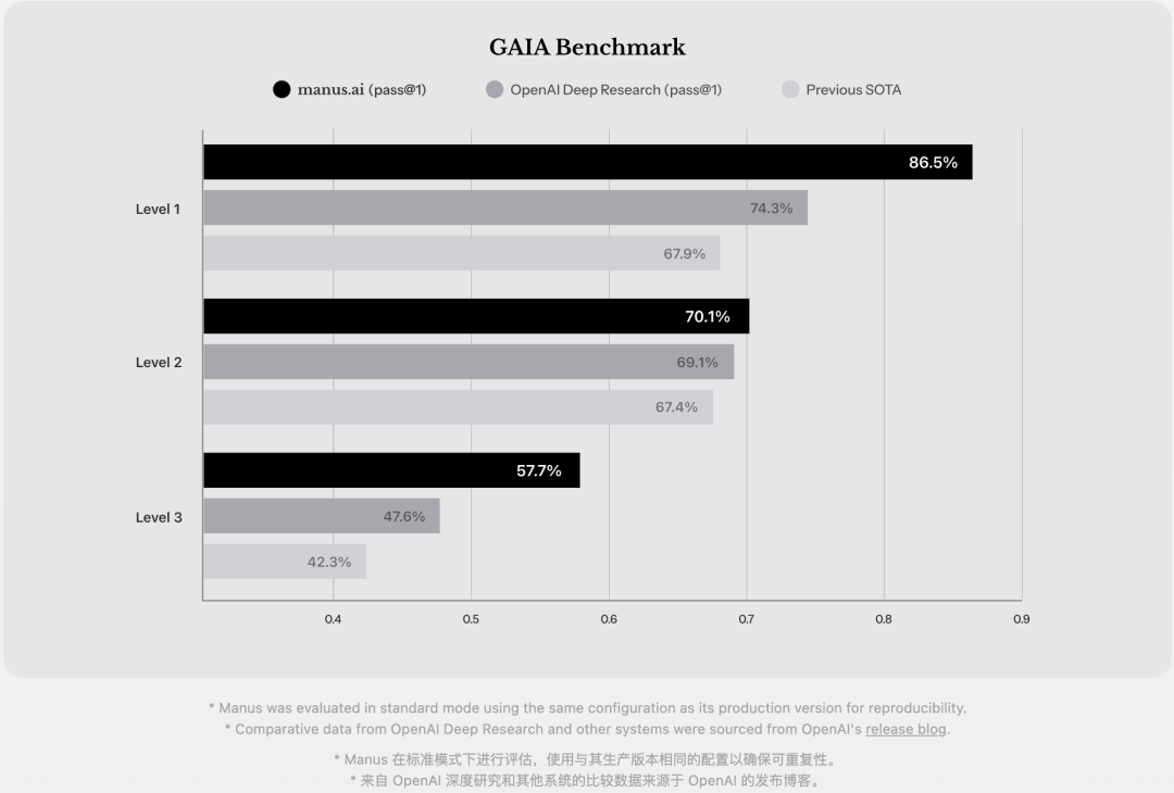2 月 27 号凌晨,Manus 产品合伙人张涛和首席科学家季逸超(Peak)看到 Manus.im 打榜成绩出来的一瞬间,两位都落泪了。Manus 在 GAIA Benchmark 上的成绩超过 OpenAI 的 Deep Research,而且以 OpenAI 打榜时 1/10 左右的成本(2 美元/任务)做到了这个意外的成绩。