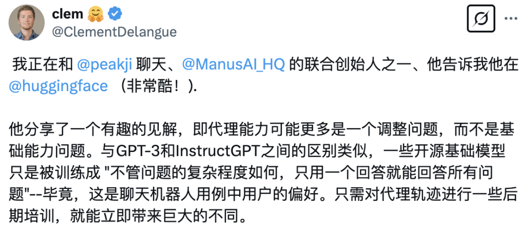 Hugging Face 创始人、CEO Clement Delangue 在 X 平台提出 Peak 的发现值得思考:智能体的能力不是卡在基座模型上,而是像 GPT-3 与 InstructGPT(ChatGPT)的差别一样,是对齐的问题。一些开源基础模型被简单训练成「无论问题的复杂程度如何,都能在一个轮次中回答完所有问题」,但这是聊天机器人场景中的要求,只需要对智能体的路径做一些后训练,就能立即带来巨大的不同。|截图来源:X