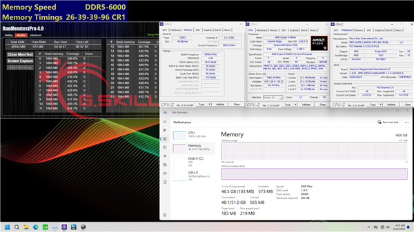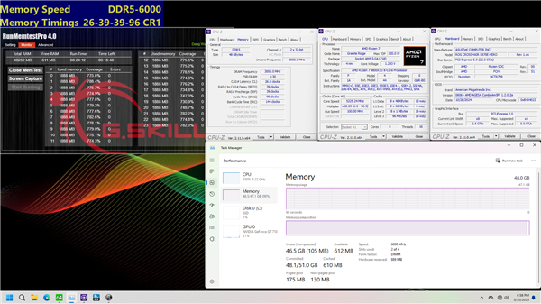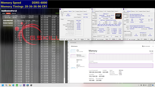 DDR5-6000 CL28-36-36 192GB(48GB×4)不但拥有超大容量,还有足够低的时序和延迟,频率也非常接近AMD锐龙的甜点,尤其适合专业内容创作。已在X870平台上完成验证,以下是锐龙7 9800X3D处理器搭配微星MPG X870E CARBON WIFI主板的烤机图: