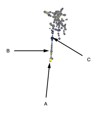 In this case, the explanations are syntactic, and not particularly semantic. In Figure 6 below, we have constructed a different topological model, in which one can see a long ‘“flare”. Each of the nodes along the flare contains several features, and we have identified three nodes along the flare, nodes, A,B, and C.