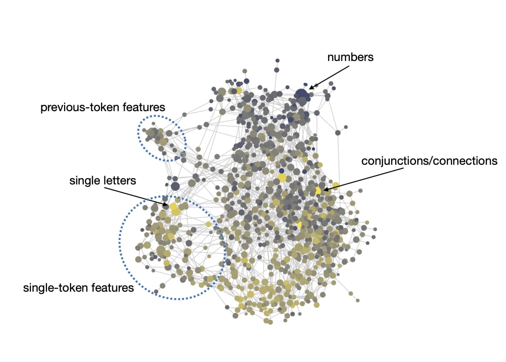Our final examples come from the analysis of sparse autoencoder features from OpenAI's GPT2-small large language model. For generalities on sparse autoencoders, please look at this. These are features that are constructed from the internal states of GPT2-small, and are designed to be more interpretable. It is also possible to find tokens with highest value for a particular feature, and that list of tokens is used to produce a kind of explanation for the feature, which can be retrieved. We have built topological models on this set of features. This allows us to produce groups of features which act similarly, and can produce explanations that cover all the features in the groups. In Figure 5 below, we display one such model for a subset of the features. We have also indicated some coherent groups that appear in the model, providing a higher level explanation for the features.