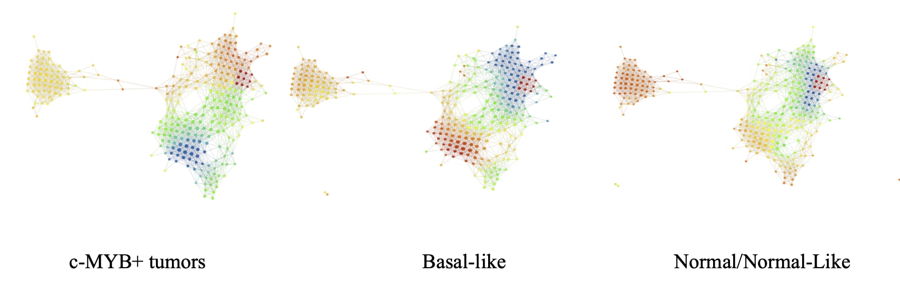 The model suggests three major groups, labeled Normal/Normal-Like, Basal-Like, and c-MYB+ tumors. The Basal-Like cohort has poor prognosis, while the c-MYB+ group has perfect survival. It is therefore of interest to compare the groups' behavior. This is a wide data set, with many genes acting in concert. It is therefore useful to construct a topological graph model of the set of features, which gives clarity into the groups. In Figure 3 below, there are three copies of a graph model of the set of genes used to construct the model of the set of patients, with a color heat map of the values of each of the genes. The graph breaks up into two strongly connected pieces, with weak connections between the two. We'll refer to them as the left and right subgraphs.